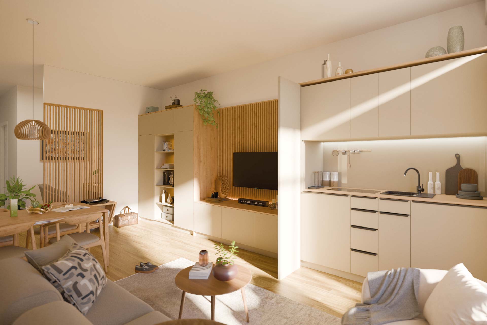 Das bequeme Bett lässt sich dabei problemlos in einen funktionalen Schreibtisch umwandeln, der Einbauschrank bietet umfangreichen Stauraum und die mit allen nötigen Elektrogeräten bestückte Schrankküche verschmilzt dezent mit dem Wohnbereich – smartes Design für eine höchste Lebensqualität auch auf kleinem Raum.