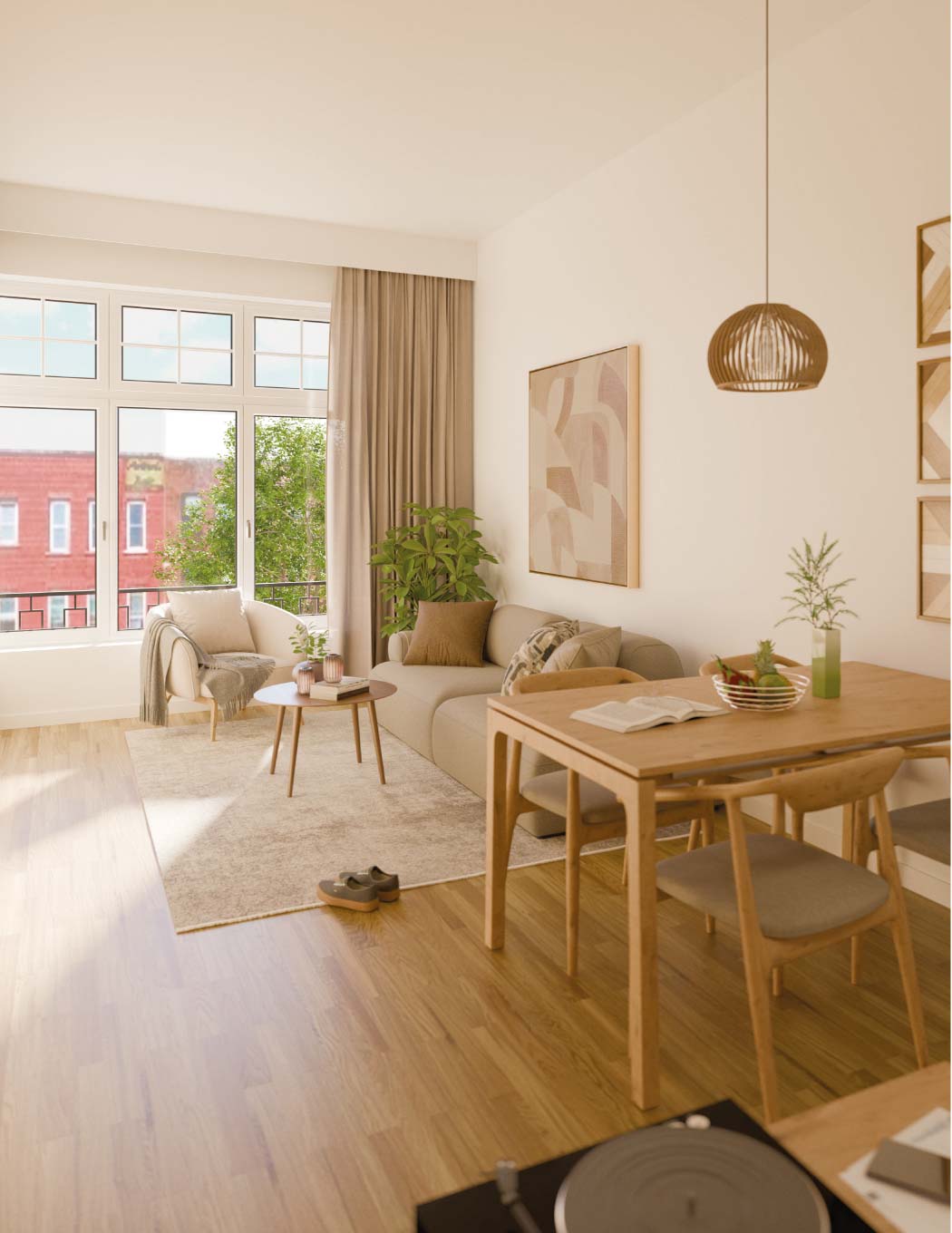 Die größeren Wohnungen im Hinterhaus erhalten im Erdgeschoss eine Terrasse und in den Obergeschossen Balkone mit Blick auf den begrünten und ruhigen Innenhof. Viele der Wohnungen sind zusätzlich barrierefrei gestaltet. So entsteht mitten in der pulsierenden Metropole Berlin ein ruhige und